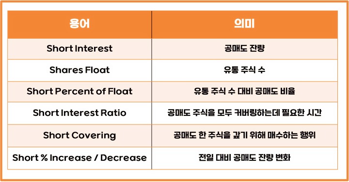 먼저 영어로 되어있는 공매도 용어를 알아야 영어로 된 해외 사이트의 공매도 잔량을 확인하고 투자에 적용할 수 있을테니 기초부터 알아보도록 하겠습니다.