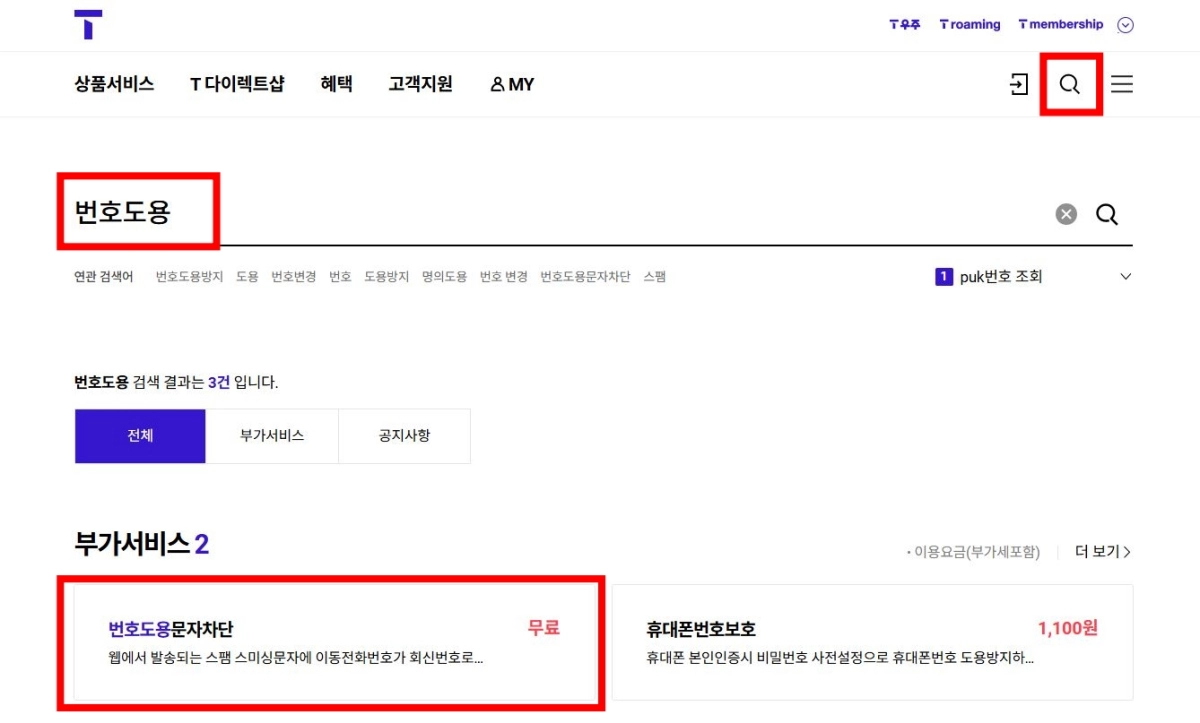 1. SKT 홈페이지에서 아래와 같이 '번호도용'을 검색하면 빨간 박스에 있는 것처럼 부가서비스를 찾을 수 있다.