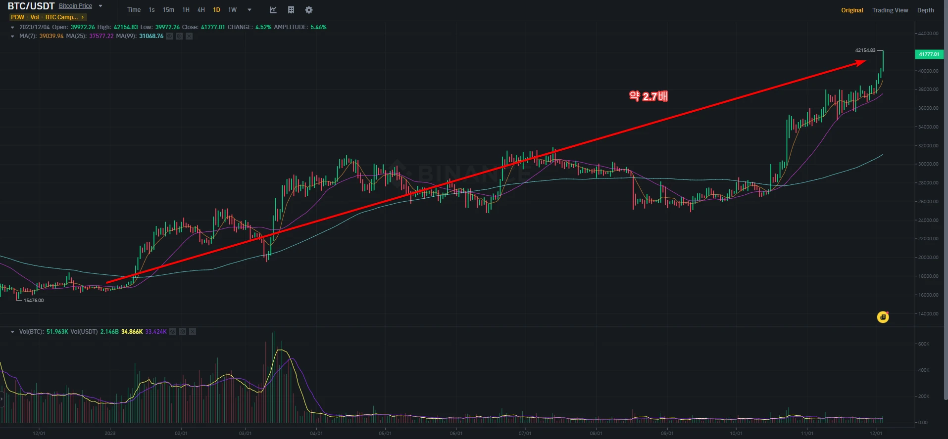 2023년 12월 4일 현재 비트코인은 41,000달러를 넘어서면서 업비트 비트코인 가격은 5600만원을 넘어섰다. 이는 2022년 4월 이후 가장 높은 가격으로 가상화폐 불장이 다시 올 것에 대한 기대가 큰 상황이다.