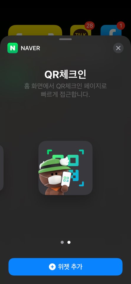 4-2. 'NAVER'의 경우, 오른쪽으로 한번만 넘기면 'QR체크인' 추가가 가능하다.