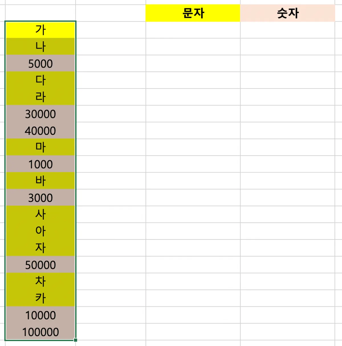 엑셀 작업을 할 때 아래와 같이 문자와 숫자가 섞여있는 데이터를 텍스트와 숫자를 따로 복사해야할 때가 있다. 데이터가 많지 않을 때는 일일이 클릭해서 복사하면 되지만, 수가 많은 경우에는 아래 설명하는 방법을 통해 해결해보자.