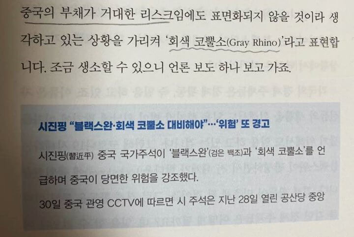 위 내용들은 경제의 흐름을 파악할 때 알아야할 용어들을 쉽게 설명해주신 내용입니다. 중국의 부채가 거대한 리스크임을 알면서도 건들지 않고 지켜본다는 점에서 착안된 '회색 코뿔소'나 최근에 생긴 용어인 FOMO(Fear of missing out) 등에 대해서 신문기사나 그림을 통해 설명해주시는 내용이 좋았습니다.