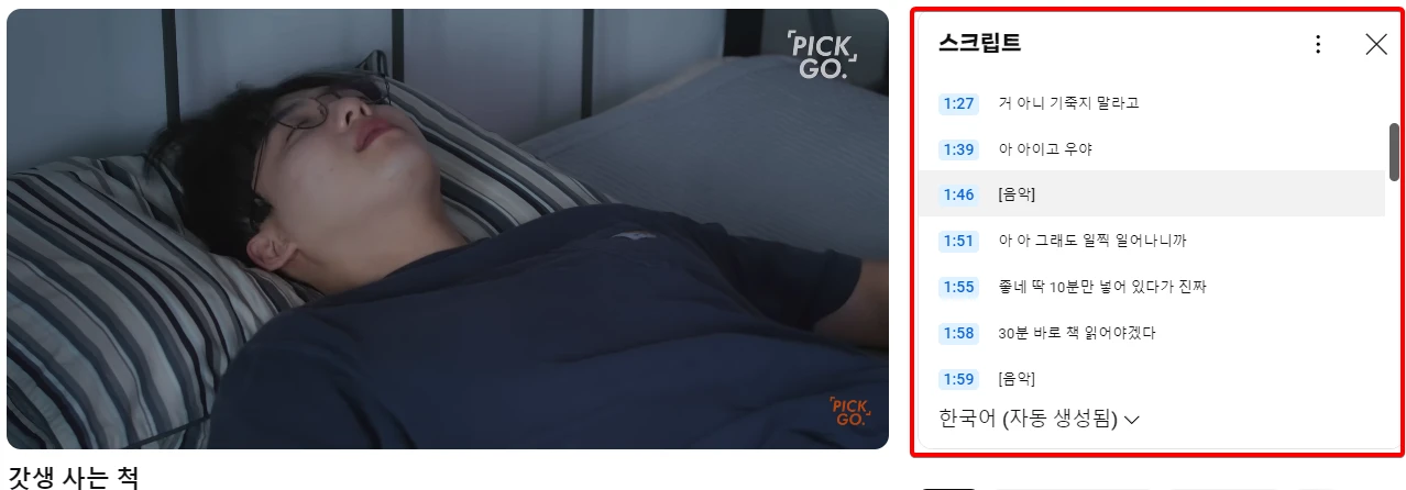 그러면 아래 그림과 같이 영상 아래나 옆에 유튜브 스크립트(자막)이 나오며 이것을 드래그하여 복사하면 스크립트를 추출할 수 있다.