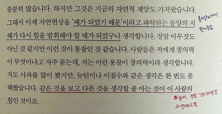 서양의 과학과 동양의 철학에 대해서 비교하면서 이제는 창의성이 중요해진 세상에서 동양의 지혜가 힘을 발휘할 때가 되었다고 얘기합니다.