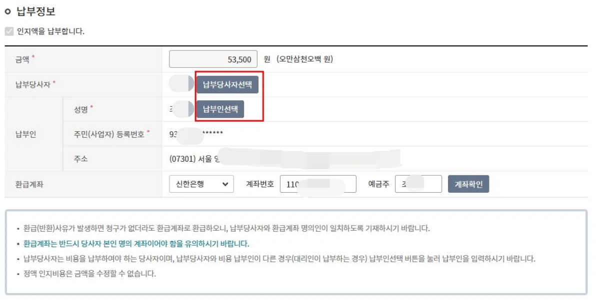 인지세는 지급명령 소송을 신청하는 비용이기 때문에 납부당사자, 납부인을 본인으로 선택해주면 된다.