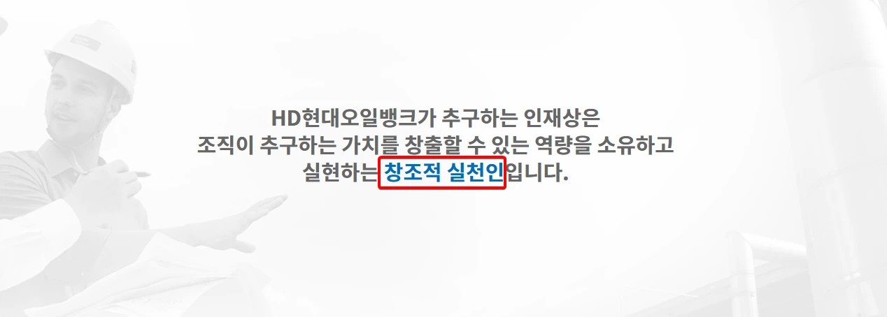 다음은 현대오일뱅크가 추구하는 인재상이다. 현대오일뱅크의 인재상 또한 지에스칼텍스와 크게 다르지 않다. 조직가치를 창출 할 수 있는 역량을 소유하고 실현하는 창조적 실천인을 원한다고 한다.