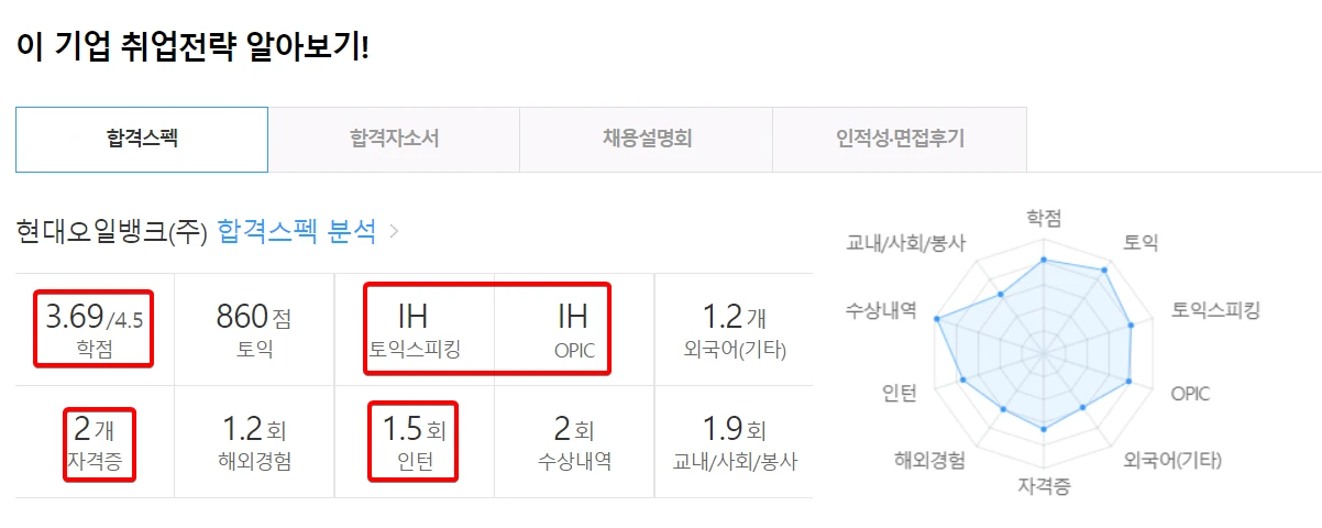 GS칼텍스와 현대오일뱅크(현오뱅) 모두 국내 4대 정유사들이기 때문에 합격한 분들의 스펙이 상당히 높은 것을 알 수 있다. 실제로 채용정보 사이트에 따르면 학점 3점 후반, 토익 800점 중반, 인턴경험 1~2회 이상, 영어 스피킹 IH 이상의 합격스펙을 가지고 있는 것으로 나타났다.
