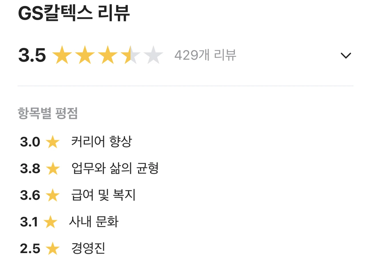 GS칼텍스 블라인드 평점은 3.5점으로 높은 급여에 비하면 낮은 평점을 보여주고 있다. 아무래도 급여 인상, 복지 관련된 부분이 소통이 되지 않아서 인지 경영진, 사내문화가 낮은 점수를 나타내고 있다.