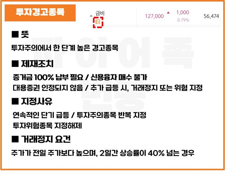 투자경고종목으로 지정될 경우에는 매수 시 증거금 100%가 필요하고 신용을 이용해 매수하는 것이 불가능합니다. 또한 주가가 전일 주가보다 높으며 2일간 상승률이 40%가 넘는 경우에는 1일 거래정지될 수 있습니다.