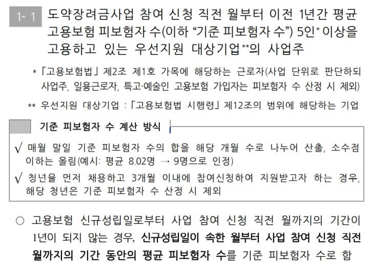 먼저 지원가능한 대상기업은 청년일자리도약장려금 참여 신청 직전 월부터 이전 1년간 피보험자 수(직원수)가 5인 이상인 기업이어야 합니다. 자세한 피보험자 기준은 글 맨 마지막에 첨부된 사업지침 파일을 확인해주시기 바랍니다.