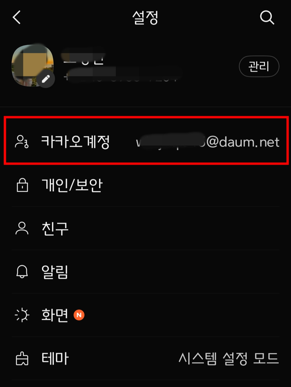 설정에 들어갔다면 카카오계정 버튼을 클릭한 다음, '로그인 관리' 버튼을 클릭하여 들어간다.