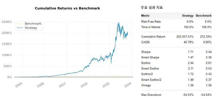 제가 작성한 전략의 백테스트 결과는 아래와 같습니다. CAGR(연평균 수익률)은 46.79%로 시장 벤치마크 수익률 6.86%에 비해 상당히 높은 것을 확인할 수 있습니다.