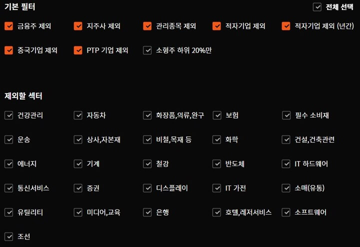 먼저 국내주식이나 해외주식을 우리가 원하는 기준으로 선정하고 투자한 결과를 백테스트해볼 수 있는 기능이 있습니다. 기본적으로 저는 강환국 작가님과 비슷하게 금융주, 지주사, 관리종목, 적자기업, 중국기업을 제외하였습니다.
