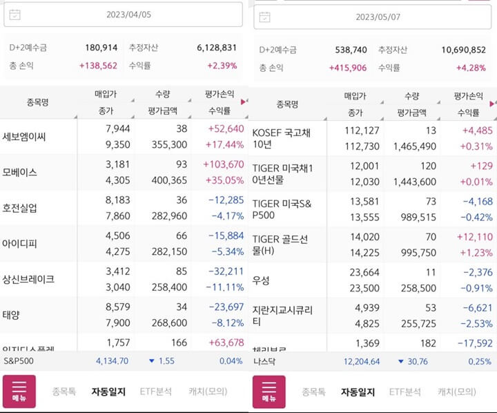 오른쪽은 2023년 4월부터 5월 현재까지 투자수익률입니다. 어느 정도 투자 결과가 확인되어 투자금을 늘렸으며 위에서 설명드렸던 것처럼 자산배분을 실시한 포트폴리오입니다. 리밸런싱 이후 시장이 크게 반등하면서 한 달 만에 전체 4.3% 정도의 수익을 보여주고 있습니다.