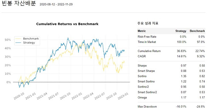 2020년부터 현재까지 기준으로 백테스트한 결과는 CAGR(연평균 수익률) 14.61%로 시장 9.32%보다 4% 이상 높은 것을 확인할 수 있습니다. 또한 MDD도 -16%로 시장 -24.5%보다 한참 낮은 것을 알 수 있네요. 올웨더 포트폴리오 짱
