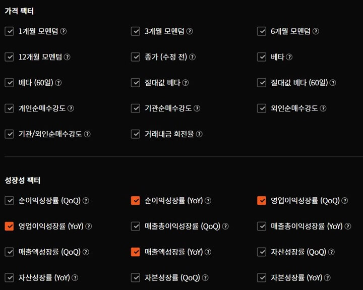 다음으로는 기업의 가격(주가)와 성장성 팩터입니다. 저는 주가 변동은 크게 고려하지 않기 위해 아예 설정하지 않았습니다.