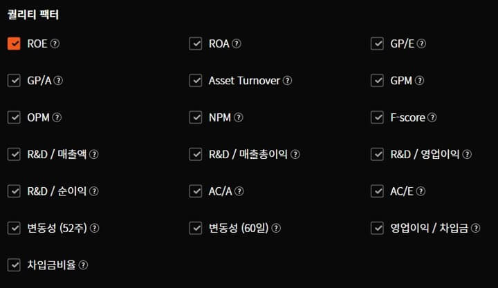 성장성 팩터는 기업의 중장기 성장의 중요한 기준이기 때문에 순이익성장률, 영업이익성장률, 매출액성장률을 YoY로 넣었고 계절성 기업을 어느정도 배제하기 위하여 영업이익성장률 QoQ를 넣었습니다.