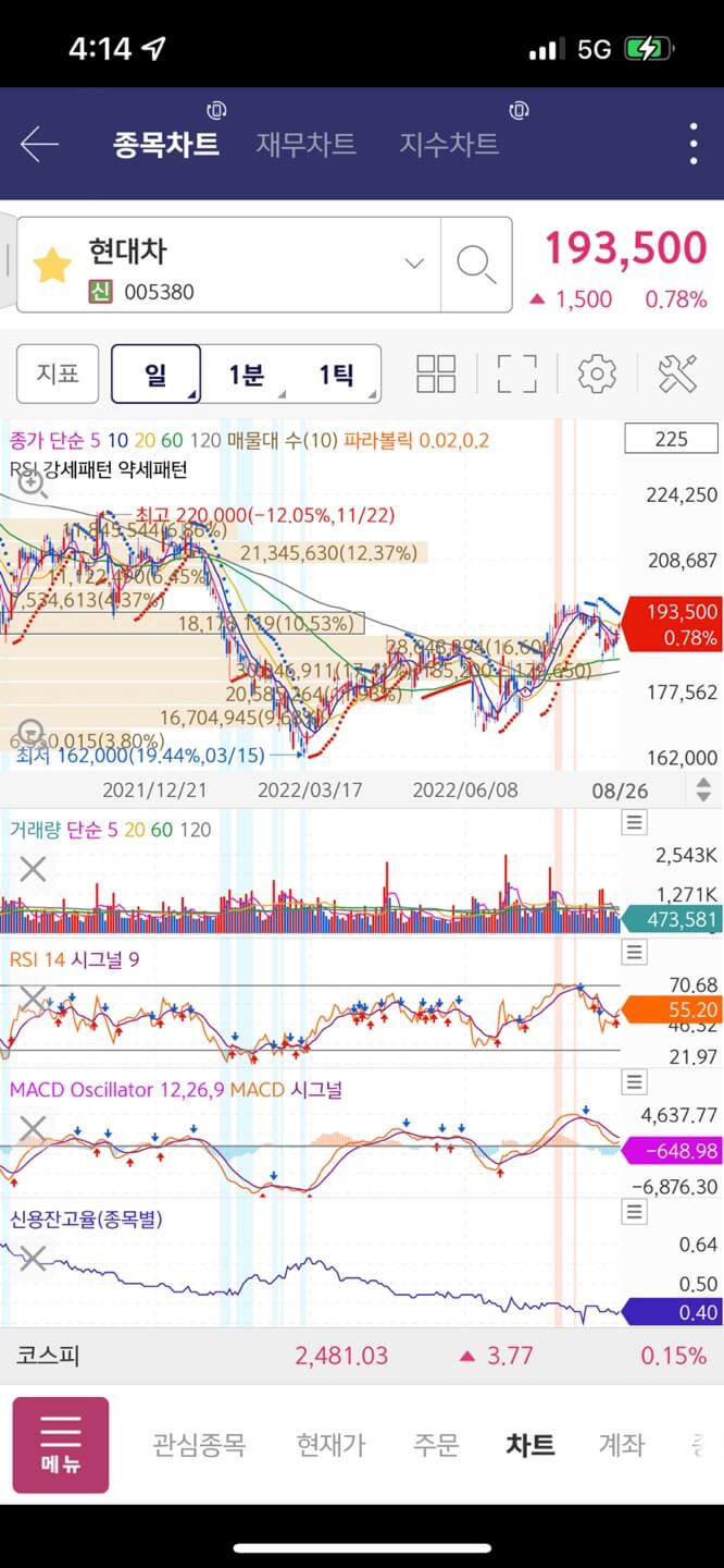 새로 출시된 영웅문s#의 세번째 장점은 차트와 보조 지표들이 기존에 사용하던 영웅문보다 깔끔해졌다는 것입니다. 지표를 사용하는 매매를 많이 하는 편은 아니지만 단기적으로 대응할 때에는 어느정도 보조지표를 참고하는 편인데, 신호검색을 설정해두면 차트에 영역으로 표시되는 점이 좋았습니다.
