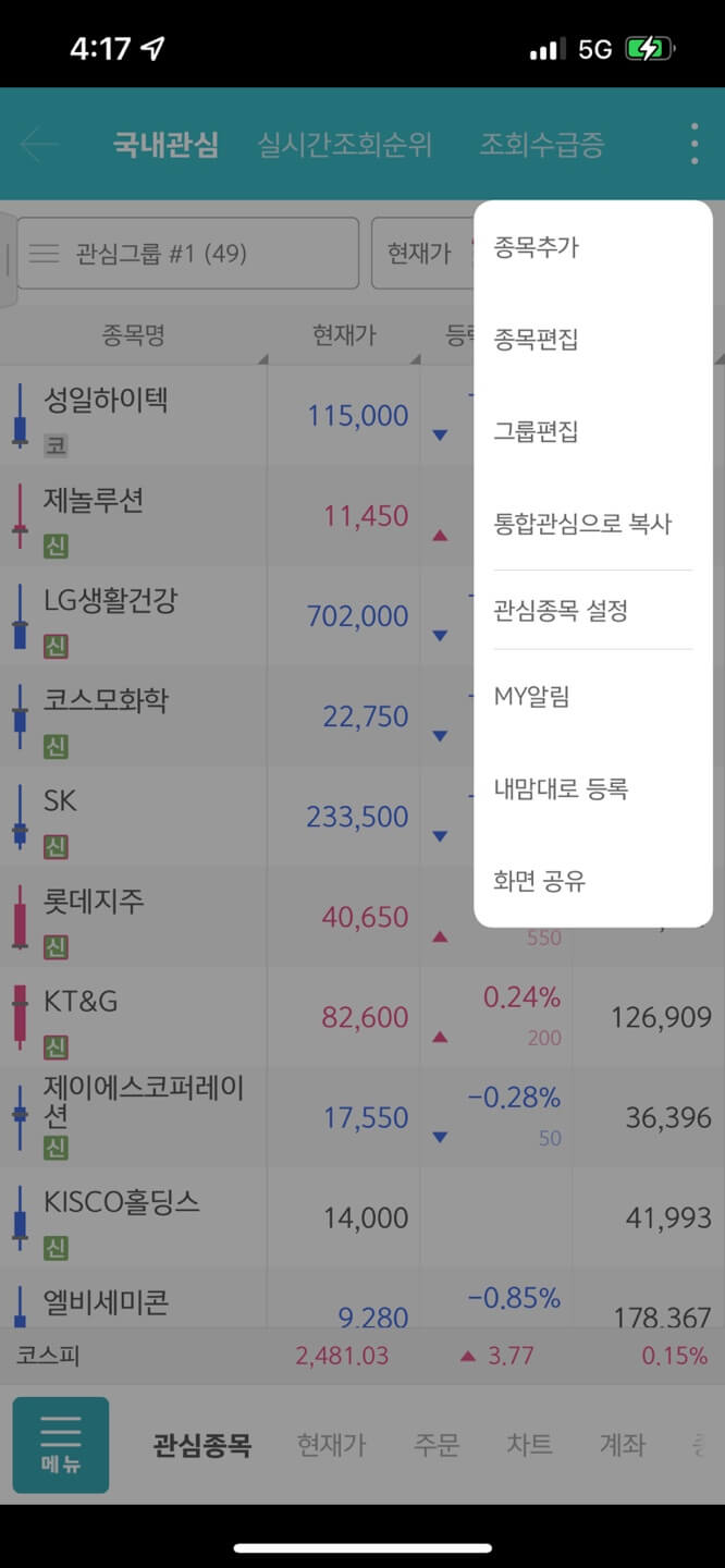 네번째는 화면 공유 기능이 생긴 점입니다. 지인과 주식에 대해서 이야기할 때 화면을 일일이 캡처해서 보여주는 것도 크게 어렵지 않지만 이렇게 화면 공유 기능이 생겨 한번에 카카오톡으로 전송할 수 있다는 점이 신기했습니다!! 자주 이용하게 되지 않을까 싶네요.
