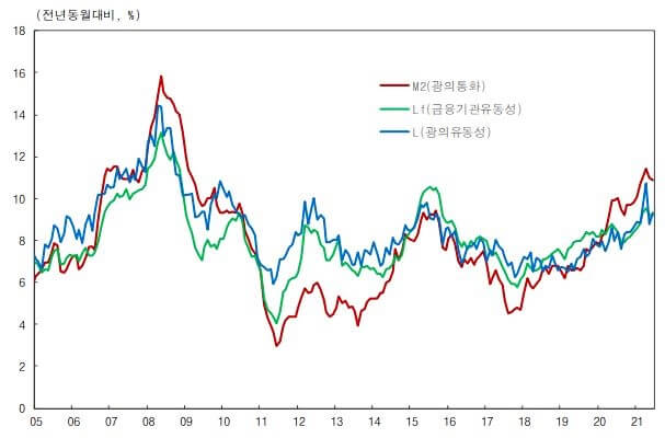 위 그래프는 21년 6월 한국은행이 발표한 통화량과 유동성지표 자료입니다.