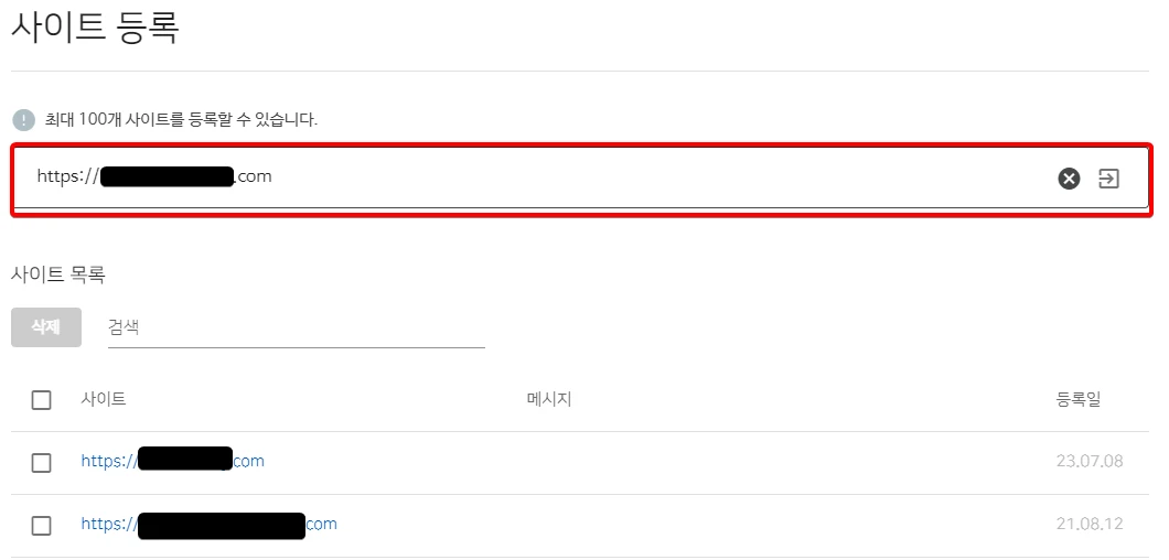 네이버 웹마스터도구에 들어가면 사이트를 등록할 수 있는 페이지가 나옵니다. 저는 기존에 등록되어 있는 홈페이지가 있지만 워드프레스 블로그를 신규로 추가해보도록 하겠습니다.