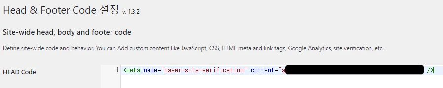 워드프레스는 지난번 구글 서치콘솔 등록에 사용했던 플러그인 'Head & Footer Code'를 이용하여 'Head code' 부분에 발급받은 네이버 검색 등록 메타태그를 입력해줍니다.