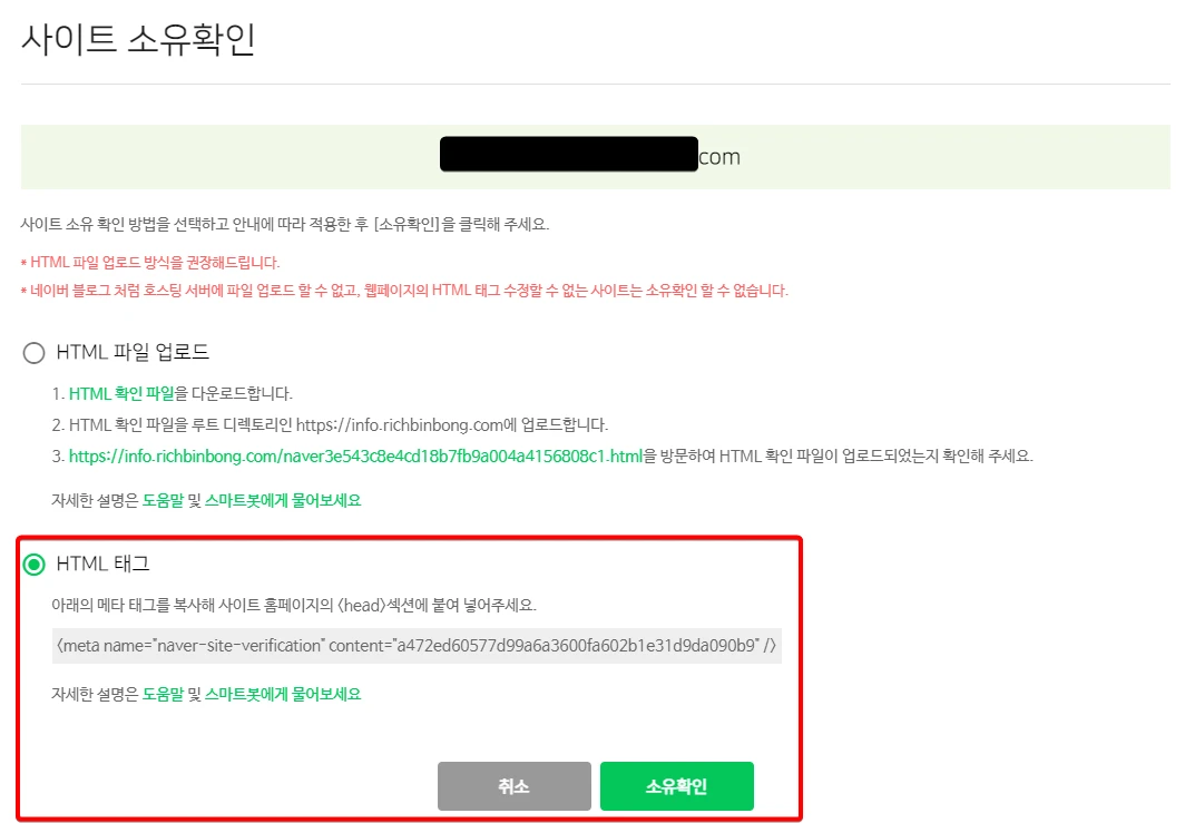 이렇게 입력한 다음 저장을 누르고 사이트 소유확인을 실행하면 아래와 같은 창이 뜨고 등록이 완료됐다고 나옵니다.