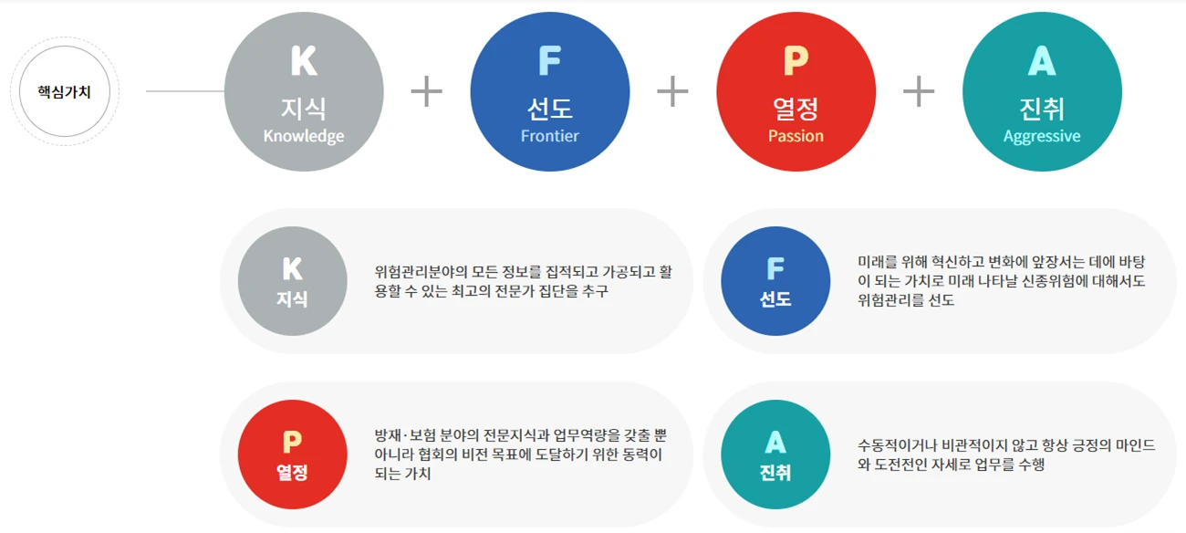 한국화재보험협회 핵심가치는 지식, 선도, 열정, 진취 네 가지로 서류와 면접 과정에서 전문성을 기르기 위해 했던 노력, 열정적으로 도전했던 경험들을 이야기하면 긍정적으로 작용할 것으로 보인다.