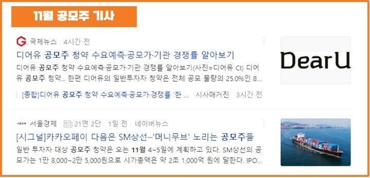 벌써부터 11월의 공모주를 대비하시는 분들이 많은 것 같습니다. 수요예측 결과가 나쁘지 않았던 디어유, 아이티아이즈, 비트나인뿐만 아니라 다가올 조선주 슈퍼사이클을 올라탈지도 모르는 SM상선까지 기다리고 있네요.