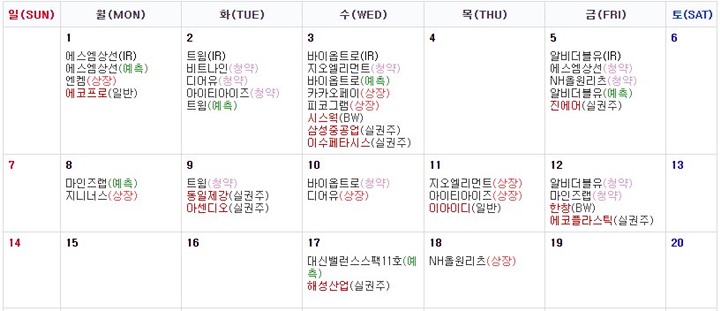 위 캘린더에서 우리가 필요한 내용은 예측(기관수요예측), 청약(공모주 청약), 상장이라고 표시된 날짜입니다. 간단하게 확인하시고 싶은 분들은 위 캘린더를 확인해주세요
