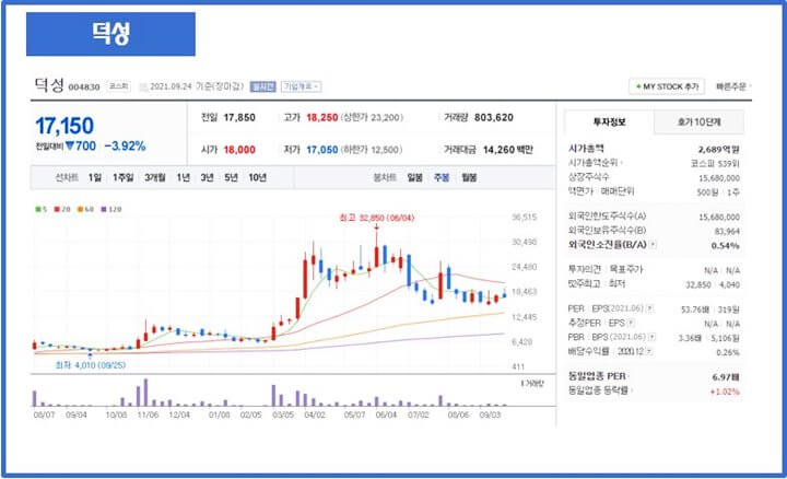 덕성이 관련주로 인식되는 이유는 덕성 이봉근 대표이사와 김원일 사외이사가 윤 후보와 서울대 법대 동문이기 때문입니다. 덕성은 2020년 초 윤석열 전 총장과 아무 관련이 없다고 공시를 하기도 했지만 이후에도 꾸준히 주가가 상승하는 모습을 보여주었습니다.