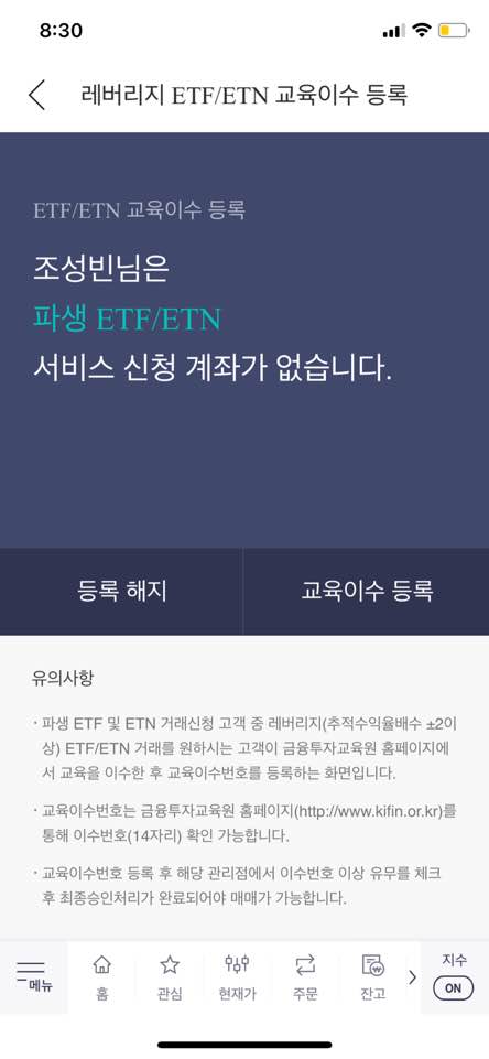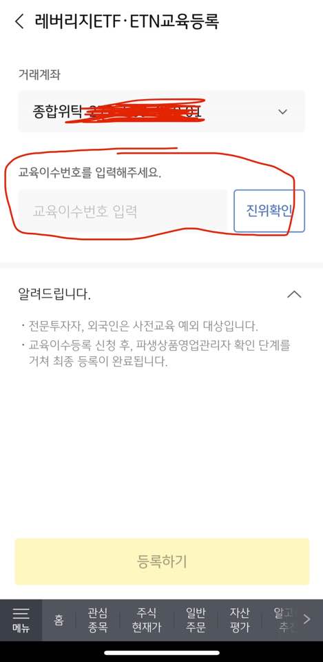 교육이수를 완료했다면 사용하는 증권사마다 레버리지 ETF 교육이수 번호를 등록해야합니다!!