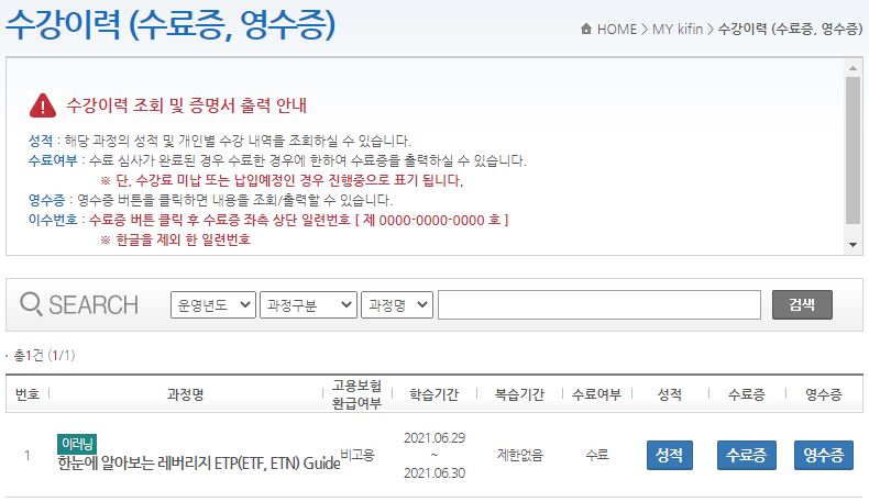 강의를 전부 수강하시고 나면 수강이력에서 이렇게 과정을 수료했다는 것을 확인할 수 있어요!!