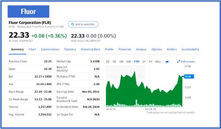 현재 국내 기업 중에서는 삼성과 GS, 두산중공업이 뉴스케일파워에 투자하고 있으며 현재 유럽시장까지 진출하여 많은 원전을 세우고 있는 기업이라고 합니다. 위 지표상으로는 현재 적자상태이지만 최근 반년동안 주가가 60%이상 상승한 상태이므로 Fluor의 주가전망을 살펴보시는 것도 좋을 것 같습니다.