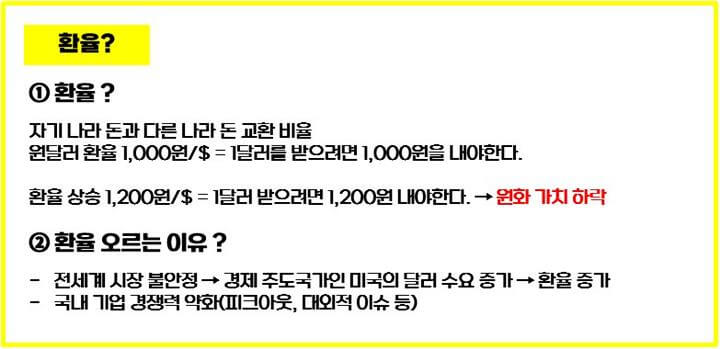 위 기사를 보면 환율과 국내 주식시장, 코스피의 등락을 같이 보도하는 기사들이 많은 것을 알 수 있습니다. 최근 지인은 염승환 이사님이 '환율이 하락하는 것을 보고 코스피가 급락을 어느정도 멈출 것이라고 예측했다'라는 이야기를 해주었습니다. 그만큼 국내 주식을 하는데 있어 환율은 중요한 지표가 될 수 있다고 합니다. 오늘은 허약한 국내 주식시장에 투자하는 주린이분들이 꼭 알아야 할 환율과 국내 주식시장의 연관성에 대해서 간단하게 알아보겠습니다.